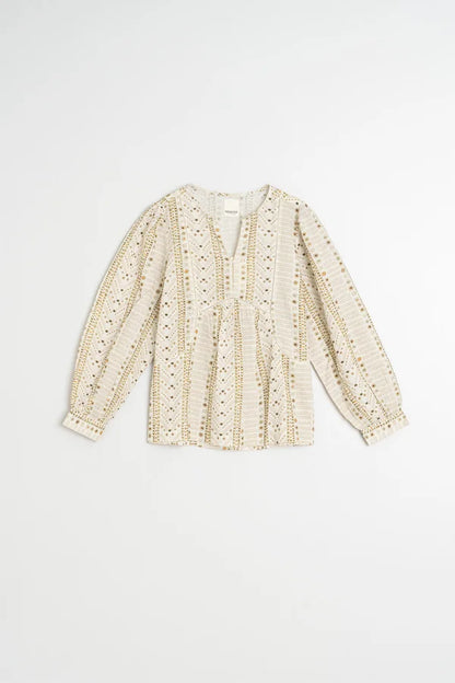 Super sød bluse fra Indi & Cold i en varm creme farve med fint boheme mønster. Ærmerne er 3/4 lange og afsluttet med bred kant.