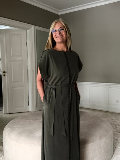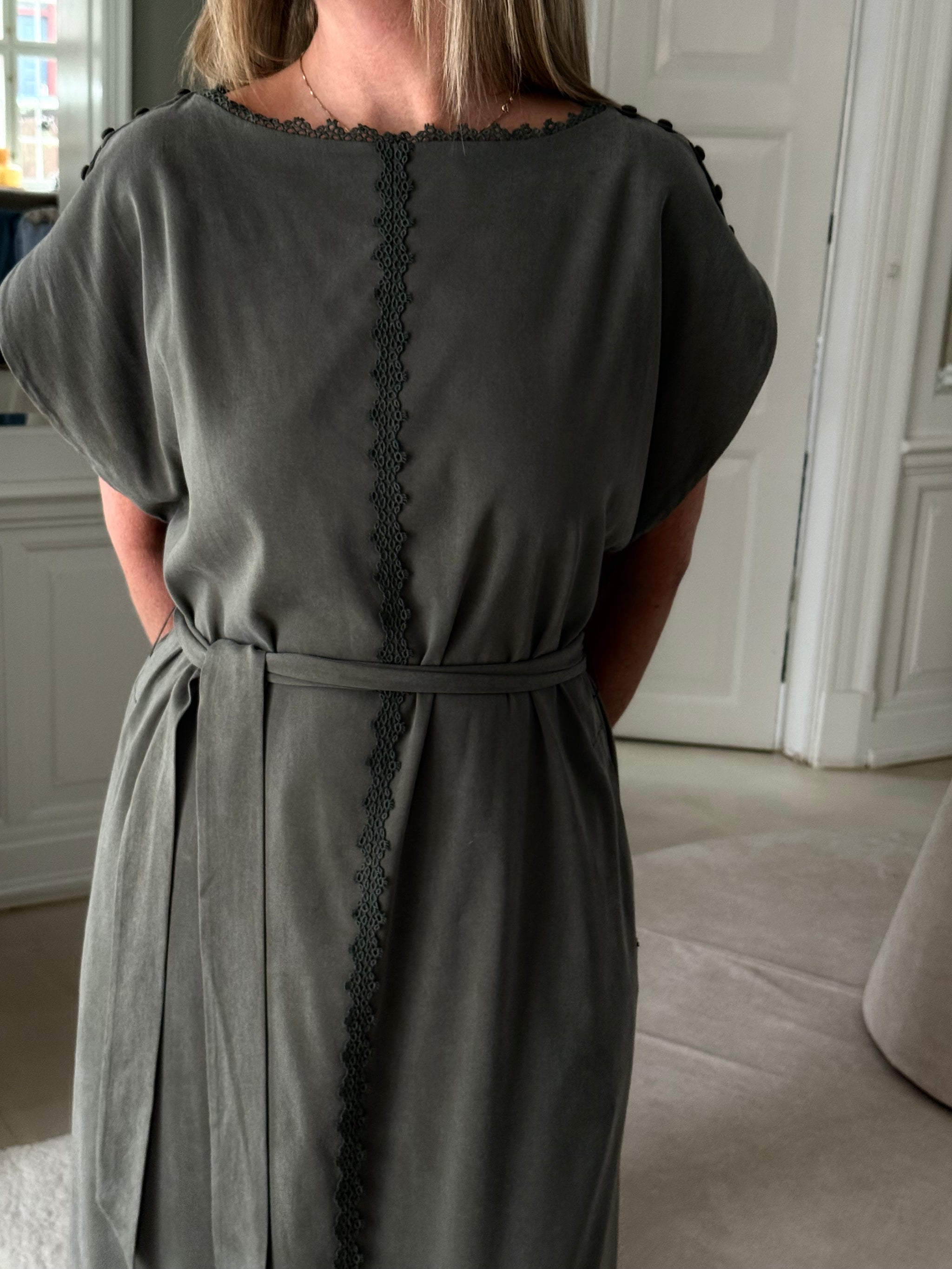 Nataline er en utrolig flot kjole i en dyb armygrøn nuance, der skiller sig ud med sine fine detaljer. Kjolen har en rund halsudskæring prydet med en diskret blondekant, som fortsætter i en lodret bane ned langs fronten. Det medfølgende bindebånd i taljen giver dig mulighed for at fremhæve din figur, mens de korte ærmer og det lette materiale sikrer et behageligt fald. Blandingen af cupro og rayon giver stoffet en smuk overflade med en smule stræk for optimal bevægelighed.