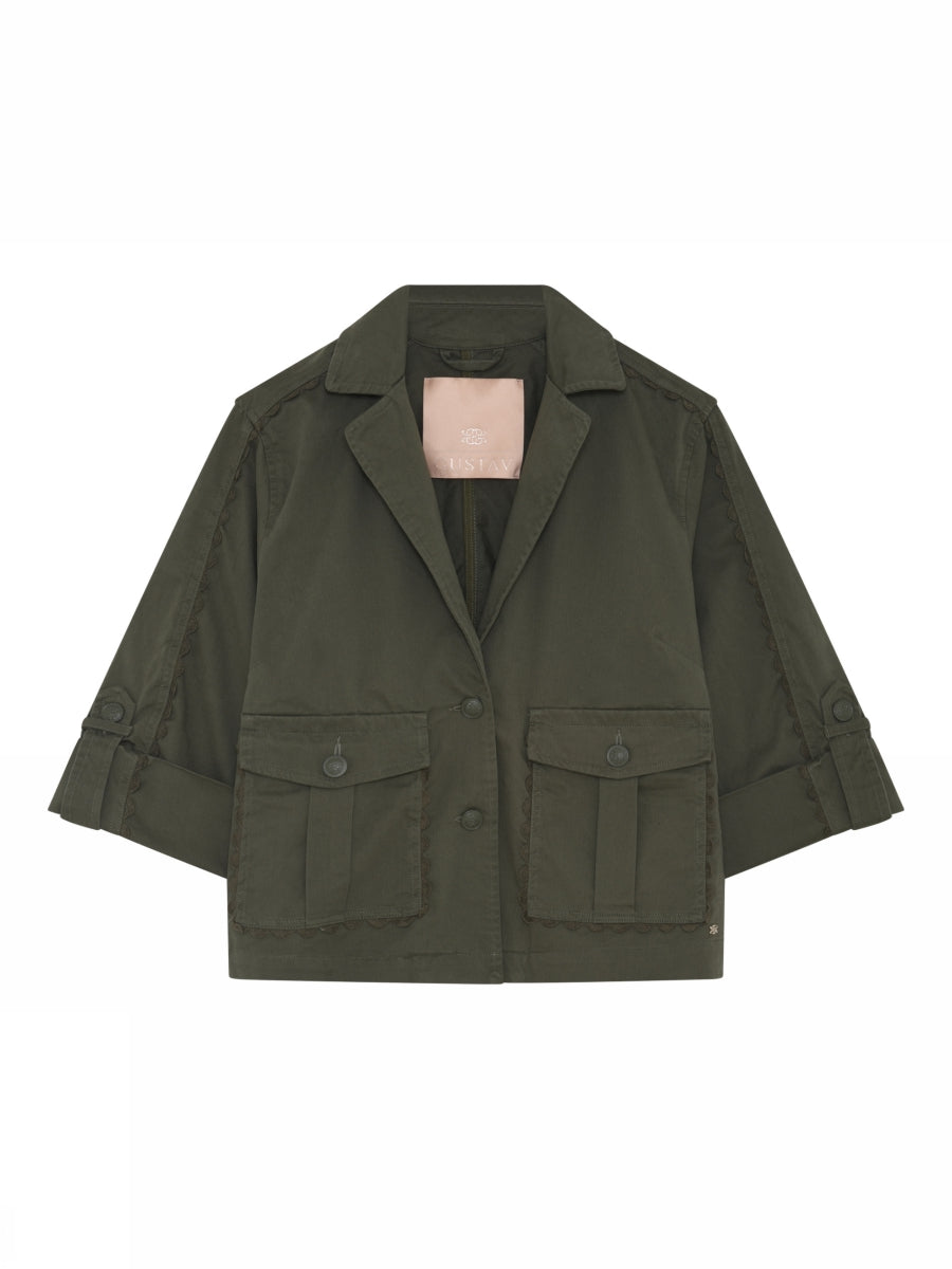 Kort jakke fra Gustav i en dyb, army grøn farve. Jakken har 3/4 lange ærmer med fedt opslag. De store lommer foran og de fine detaljer op langs ærmerne giver jakken en lækker forårs vibe. Style til lyse bukser og sæt kontrast på dit outfit. Den grønne jakke er fin at bruge som en del af din indendørs styling, mens vejret stadig er koldt. Når dagene bliver varmere, kan jakken bruges som en overgangsjakke.