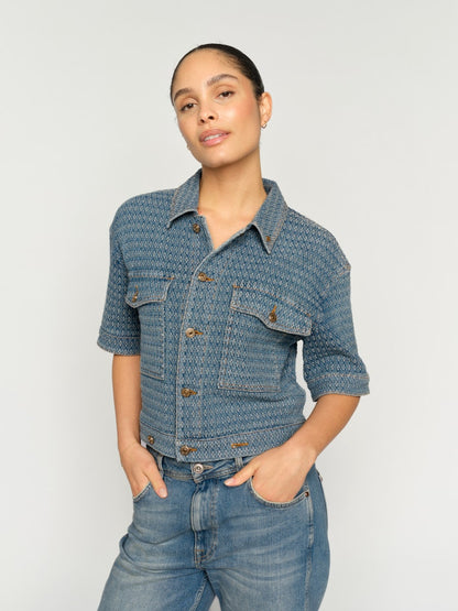 Er du på udkig efter en kortærmet denim jakke til foråret? Mos Mosh har designet den fine Ebba jakke med det firkantede snit og fine detaljer. Jakken er cropped og lukkes med gyldne knapper. Stilen passer godt ind i de modetrends, der allerede nu er fremme. Style med jeans for et rent denim look eller sæt jakken til dine lyse bukser.