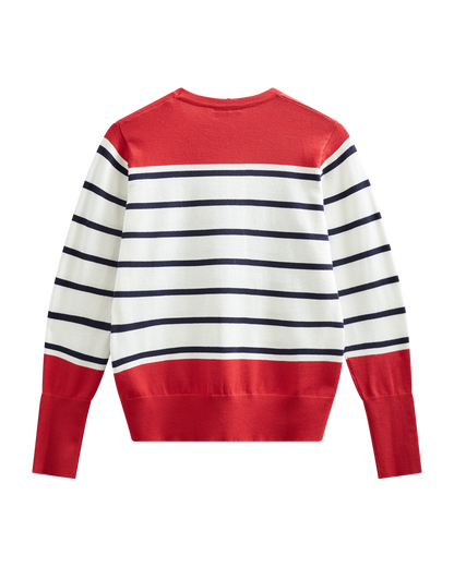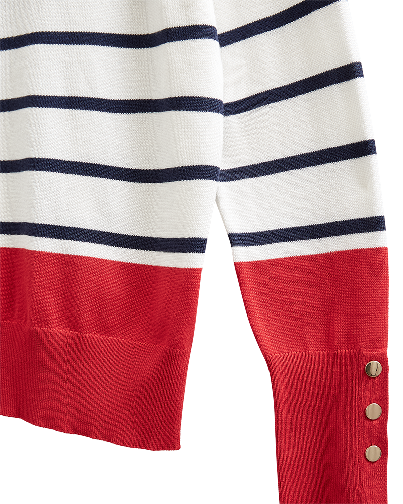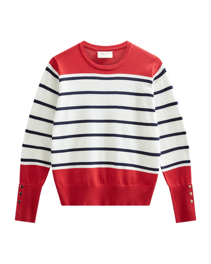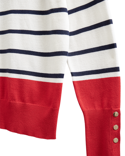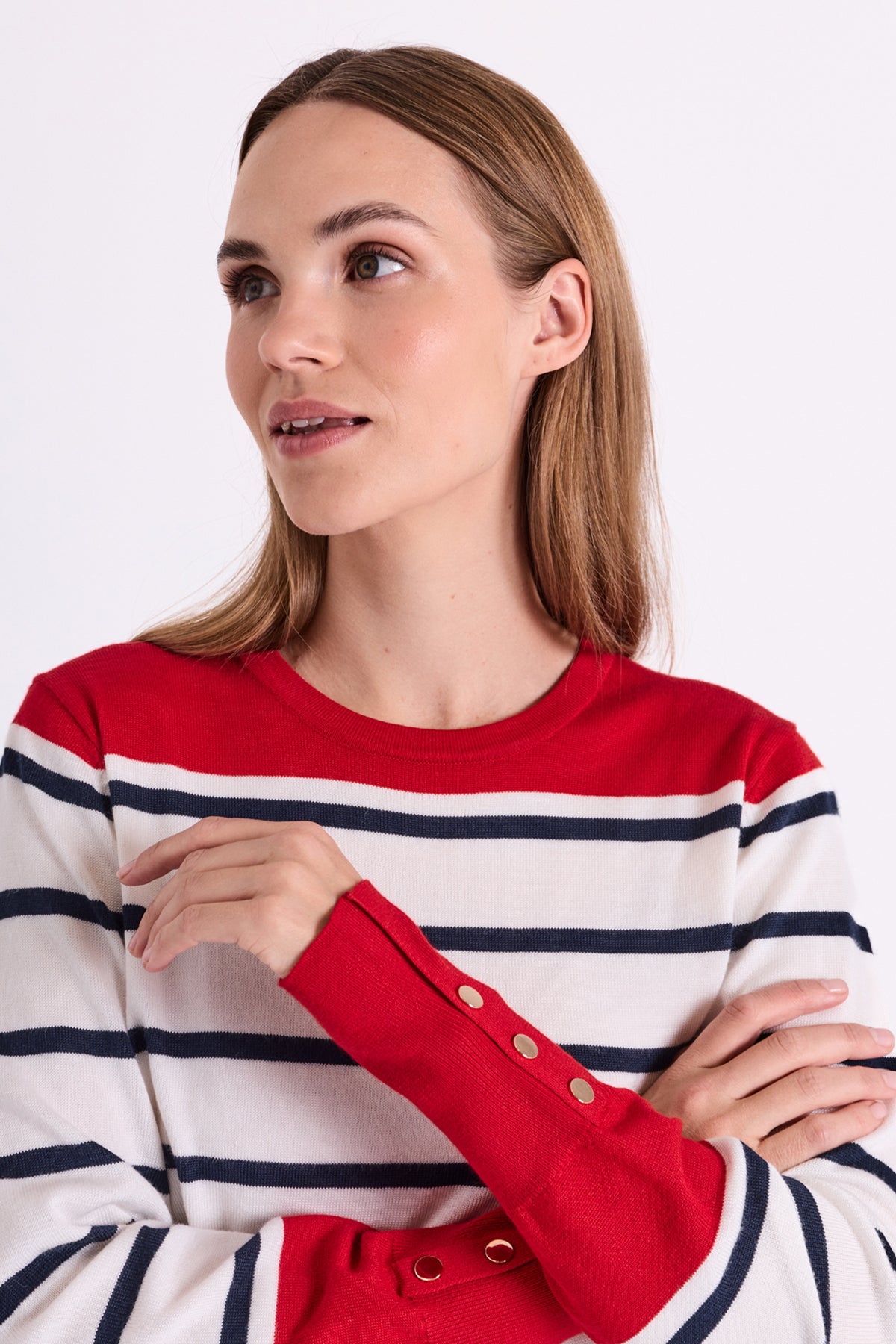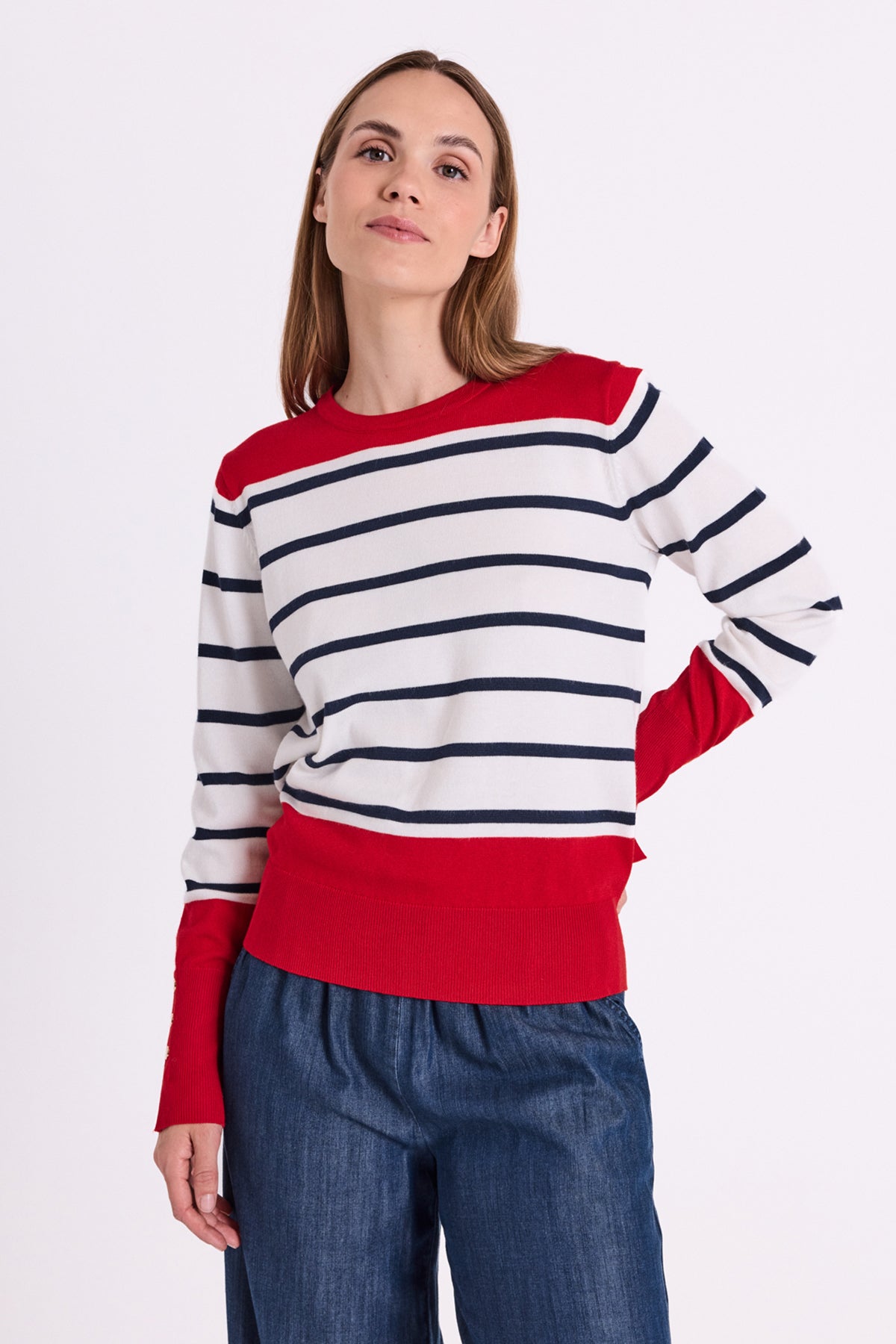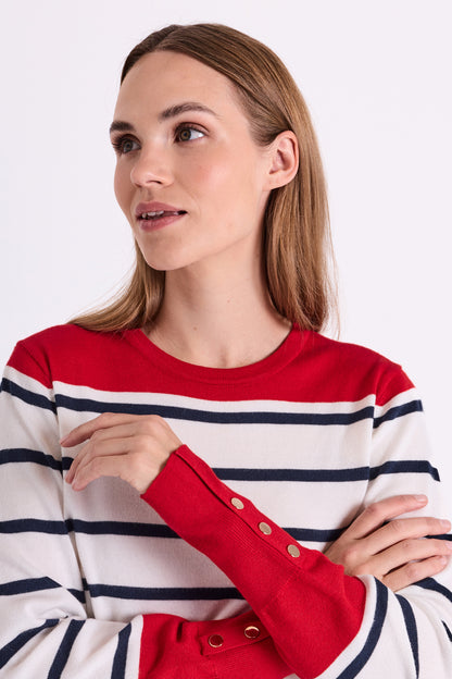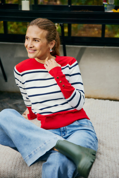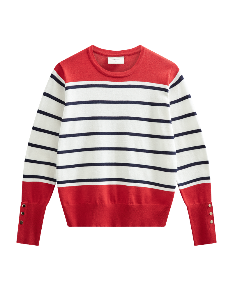 Super fin bluse fra Freequent i off white med smalle striber og røde detaljer. De høje manchetter er afsluttet med gyldne knapper og er med til at give blusen en chic pariser vibe. Style til jeans, som du ser på modelbillederne.
