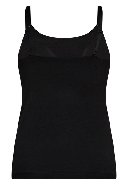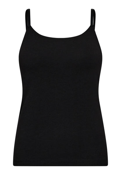 Denne sorte strop top fra JBS of Denmark er et enkelt og funktionelt valg til din garderobe. Toppen er fremstillet i en blød blanding af økologisk viscose, økologisk bomuld og elastan, hvilket giver stoffet en behagelig finish. En særlig detalje ved denne model er den indlagte støtte til barmen, som gør det muligt at bruge toppen uden en bh under. Toppen har smalle stropper, der kan justeres i længden for at tilpasse placeringen på skuldrene.