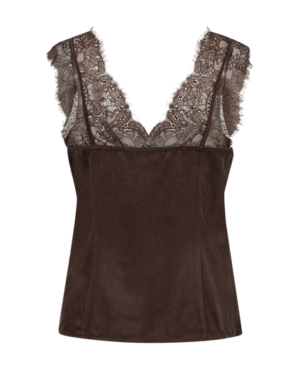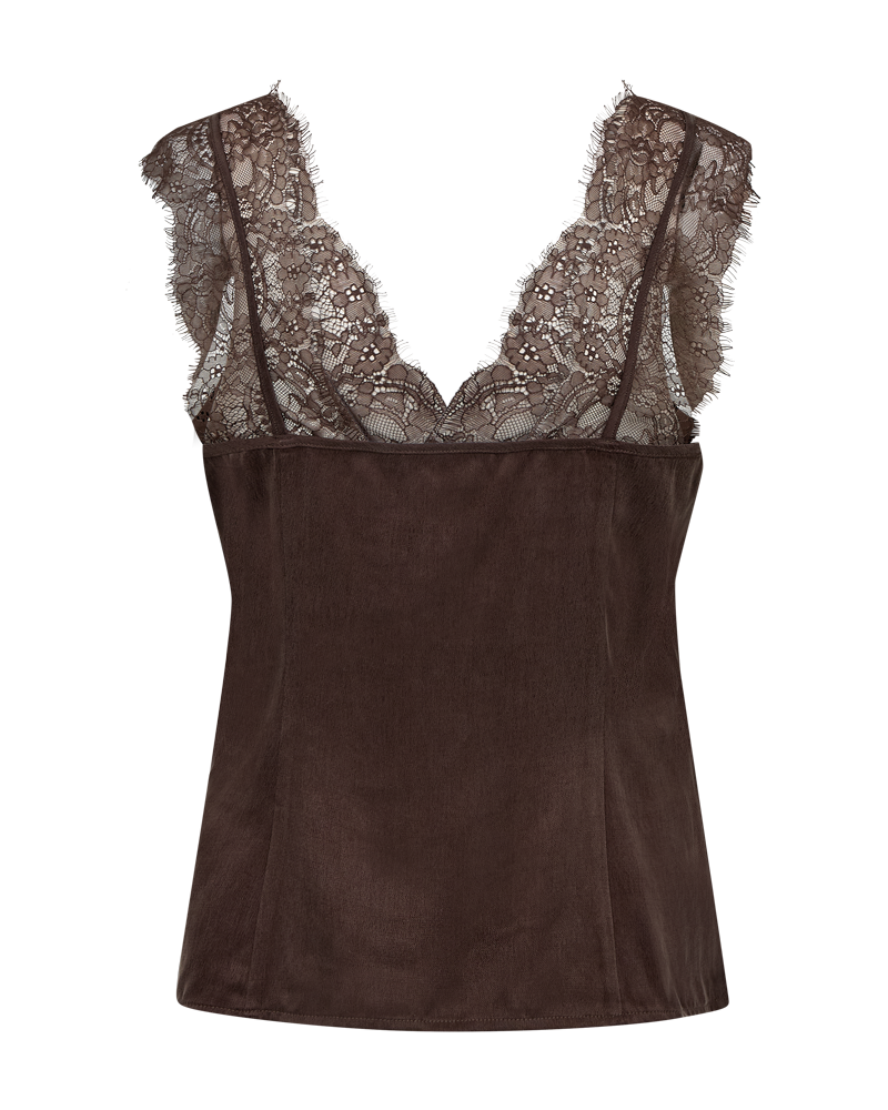 Feminin top fra Copenhagen Muse med fine blonder ved stropper og udskæring. Toppen har egentlig smalle stropper, men den brede blonde giver toppen et virkelig feminint look. Toppen er figursyet og er lavet i en lækker blanding af cupro og viskose. Style til lyse bukser og fremhæv den varme, chokoladebrune farve.