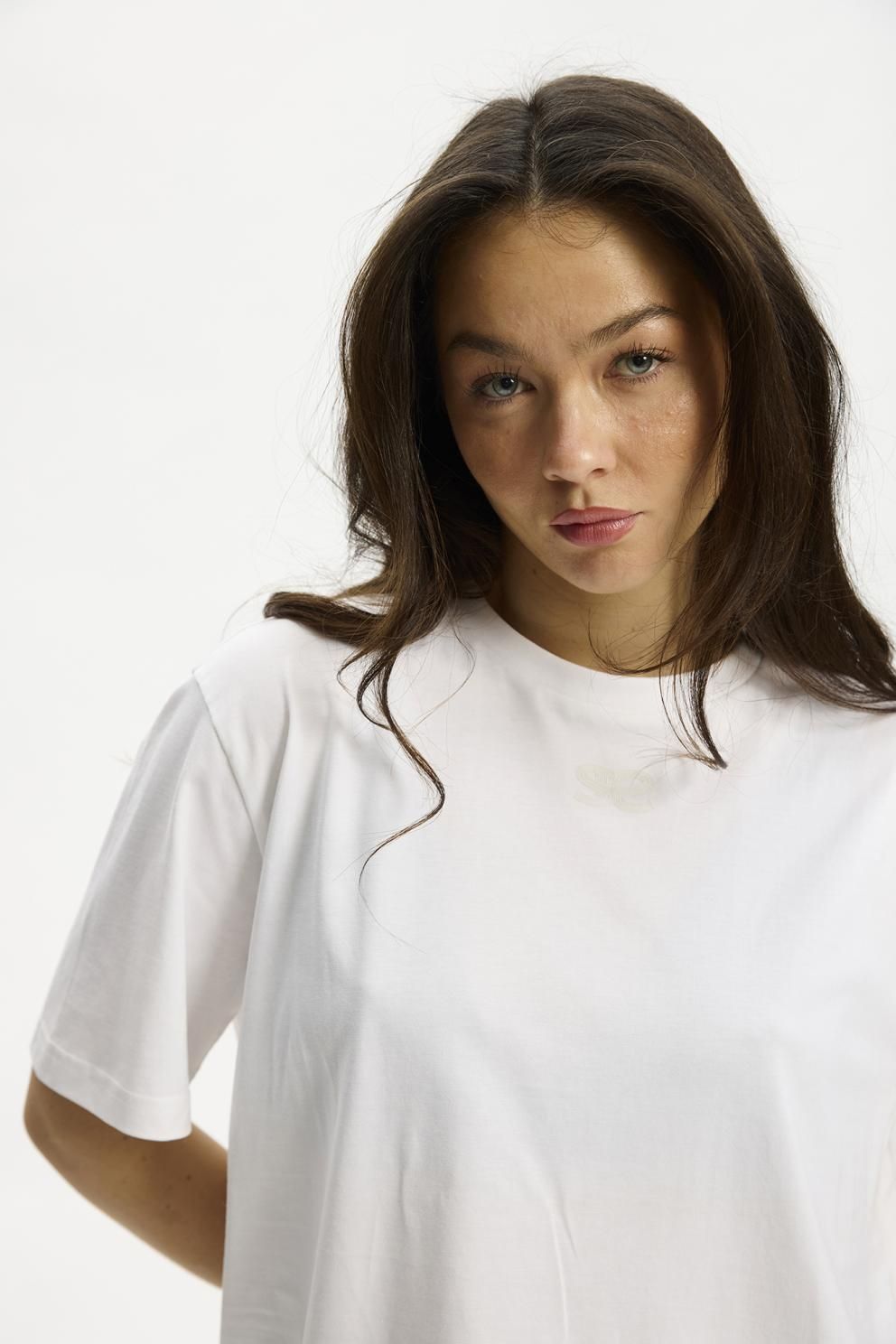 Enkel, hvid t-shirt fra Kopenhaken i kraftig bomuld. T-shirten har rund halsudskæring og et løst snit, så den bliver lidt oversize og lækker at se på. Style til sorte bukser for et enkelt men klassisk look.