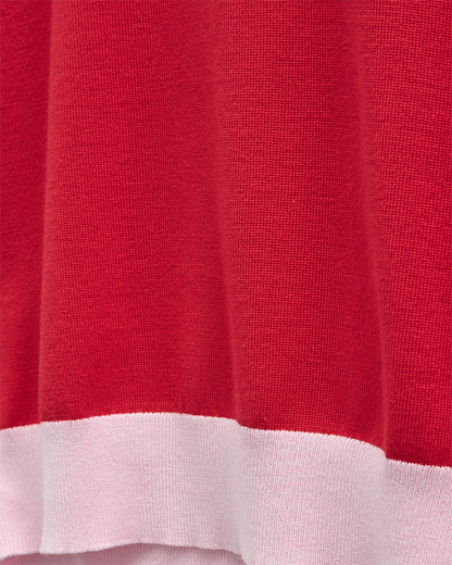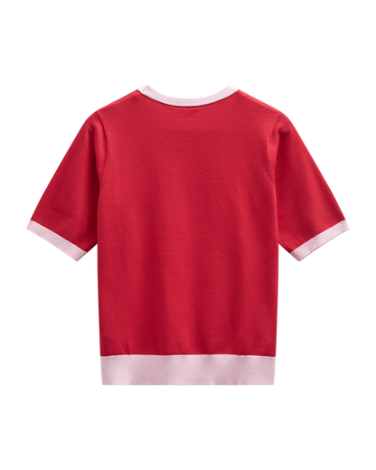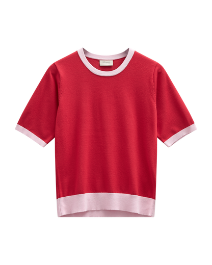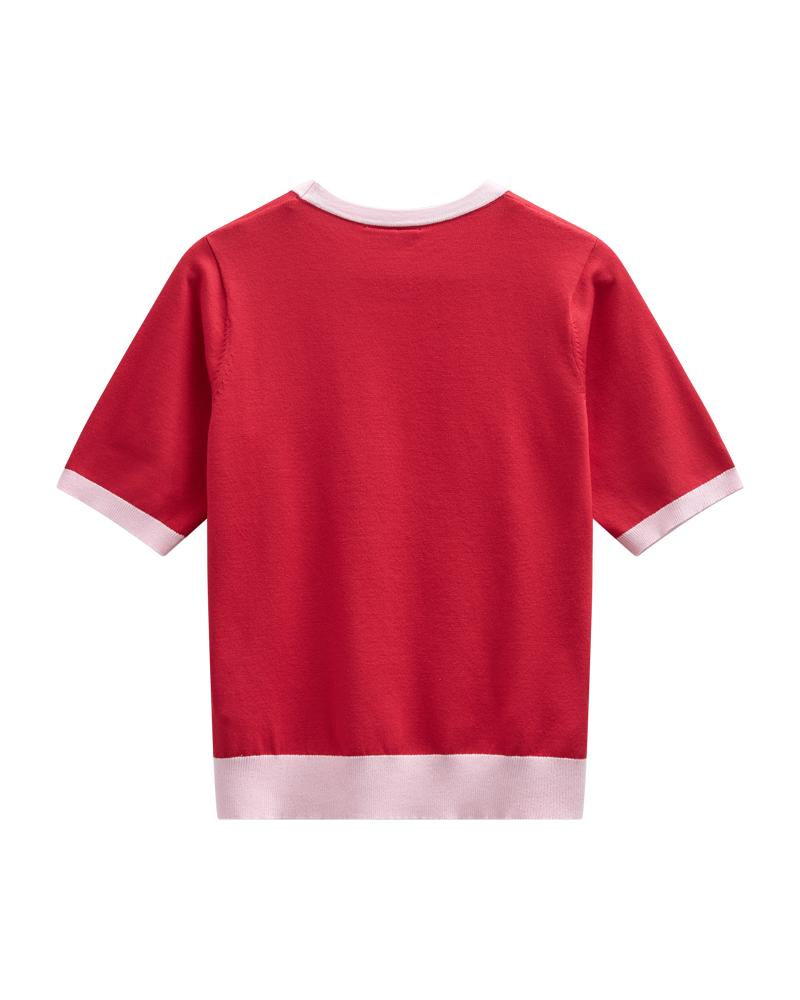 Rød kortærmet bluse fra Freequent med de fineste ribkanter i rosa. Kontrasten mellem de to farver giver blusen et feminint look. Style til off white eller denim afhængig af, hvilket udtryk du gerne vil have frem i dit outfit.