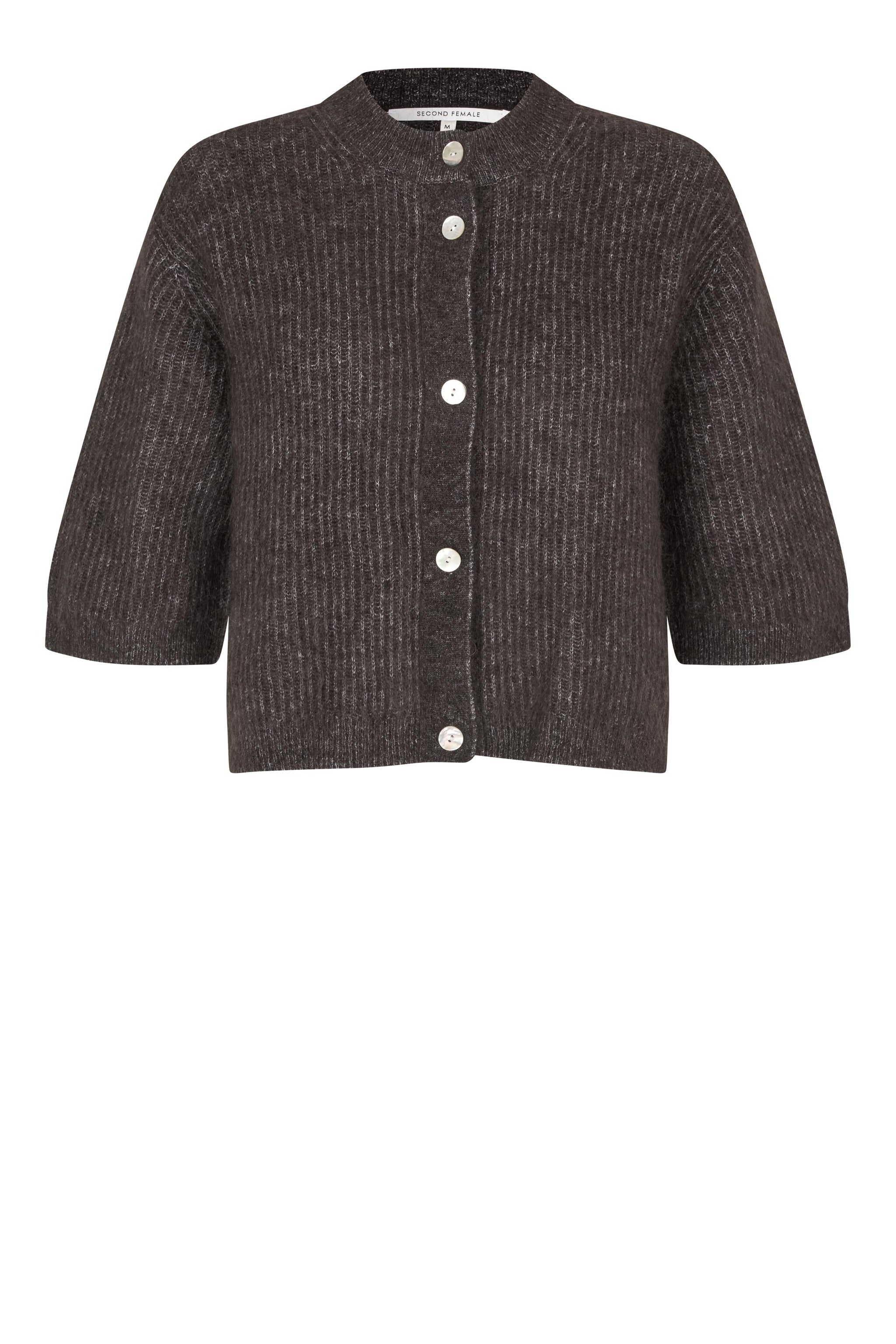 Andrea fra SECOND FEMALE er en skøn cardigan i en dyb mørkebrun farve, som de kalder Chocolate Tort. Den er strikket i en blanding med både mohair og uld, hvilket giver overfladen et let loddent og blødt udtryk. Cardiganen har en fin rib struktur og skiller sig ud med sine halvlange ærmer, der stopper ved albuen, samt de lyse knapper langs fronten, der giver en flot kontrast.