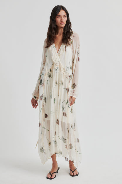 Denne Florale kjole er lavet i 100% viskose og har et fint blomstret mønster på en off-white baggrund. Kjolen har lange ærmer med elastik ved håndleddene og en V-udskæring, der er dekoreret med flæser og bindebånd. I taljen finder du et bredt stykke med elastik, som giver kjolen form, mens selve skørtet falder let ned til omkring læggene.