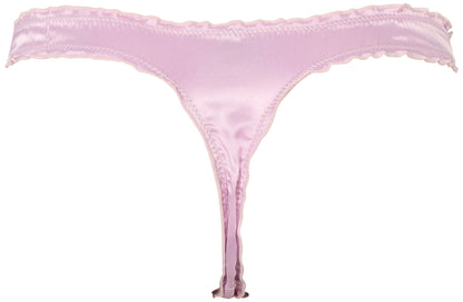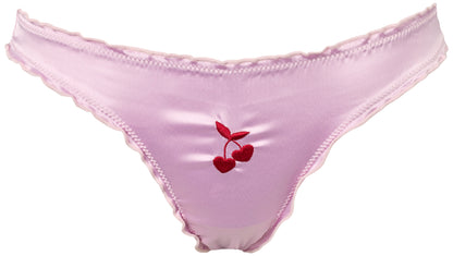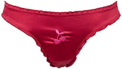 Denne pakke fra Missya indeholder to G-strenge i et elegant satin-look. Designet er detaljeret med fine bølgede kanter og et karakteristisk kirsebær-broderi på fronten, der giver et gennemført visuelt udtryk. Materialet har en glat overflade med en let glans, som komplementerer de dybe farvenuancer.