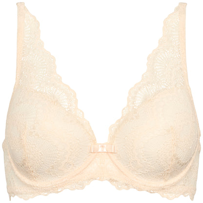 Denne bh kombinerer funktionel støtte med et feminint design i en blød, lys nuance. Modellen er konstrueret med bøjle og vattering, der sikrer en flot form og optimal støtte gennem hele dagen. De fine blondedetaljer dækker skålene og fortsætter op ad stropperne, hvilket giver et gennemført og sofistikeret udtryk.