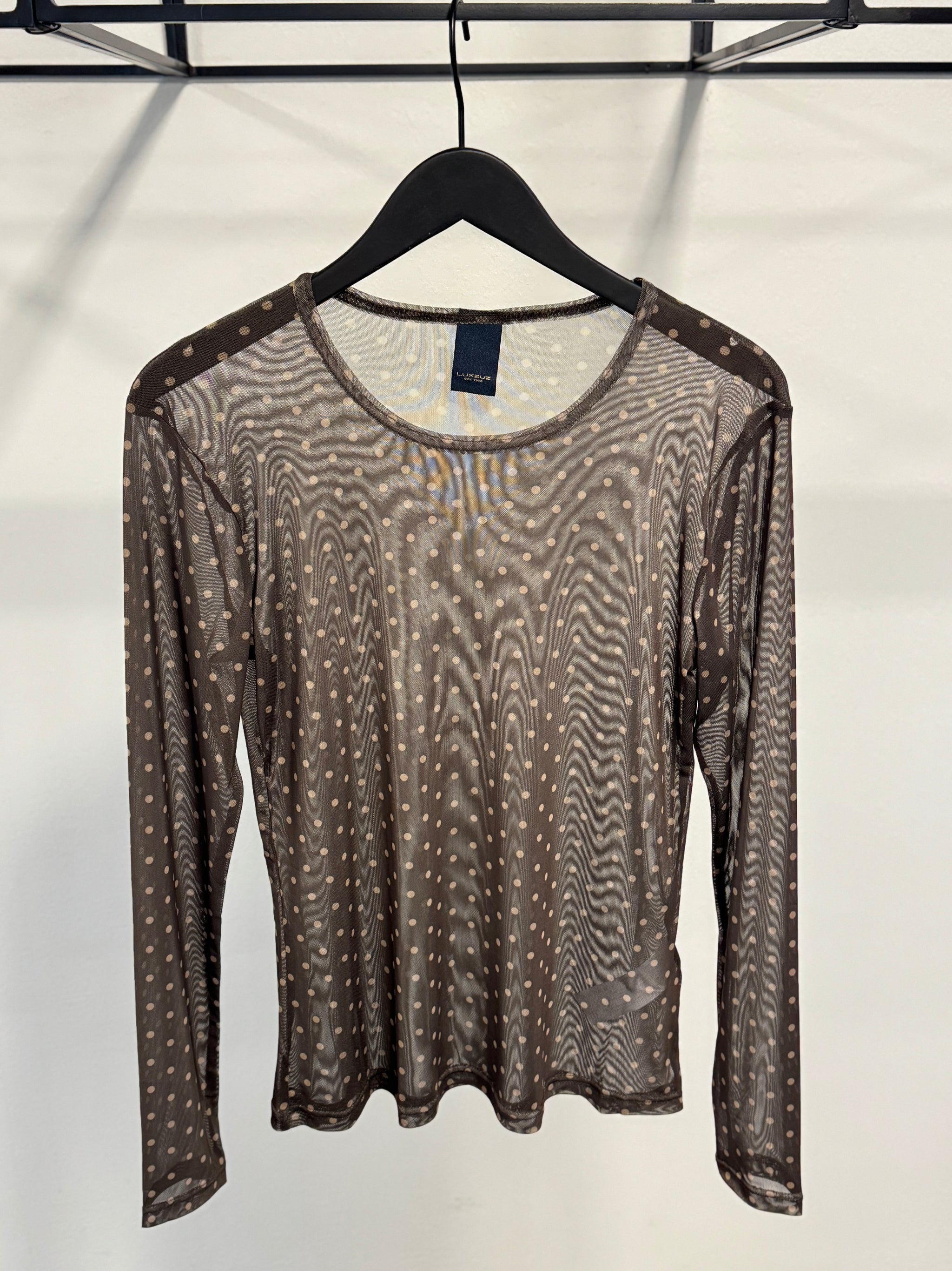 Sigdotti er en let og gennemsigtig mesh-top i en dyb mørkebrun farve, som Luxzuz kalder Coffee Bean. Toppen er dekoreret med fine, lyse prikker over det hele, der giver et fint spil til det mørke stof. Den har lange ærmer, en klassisk rund halsudskæring og er lavet i en strækbar kvalitet med 10% elastan. Du kan bruge den som et let lag under en strik eller lade det prikkede mønster stå frem alene.