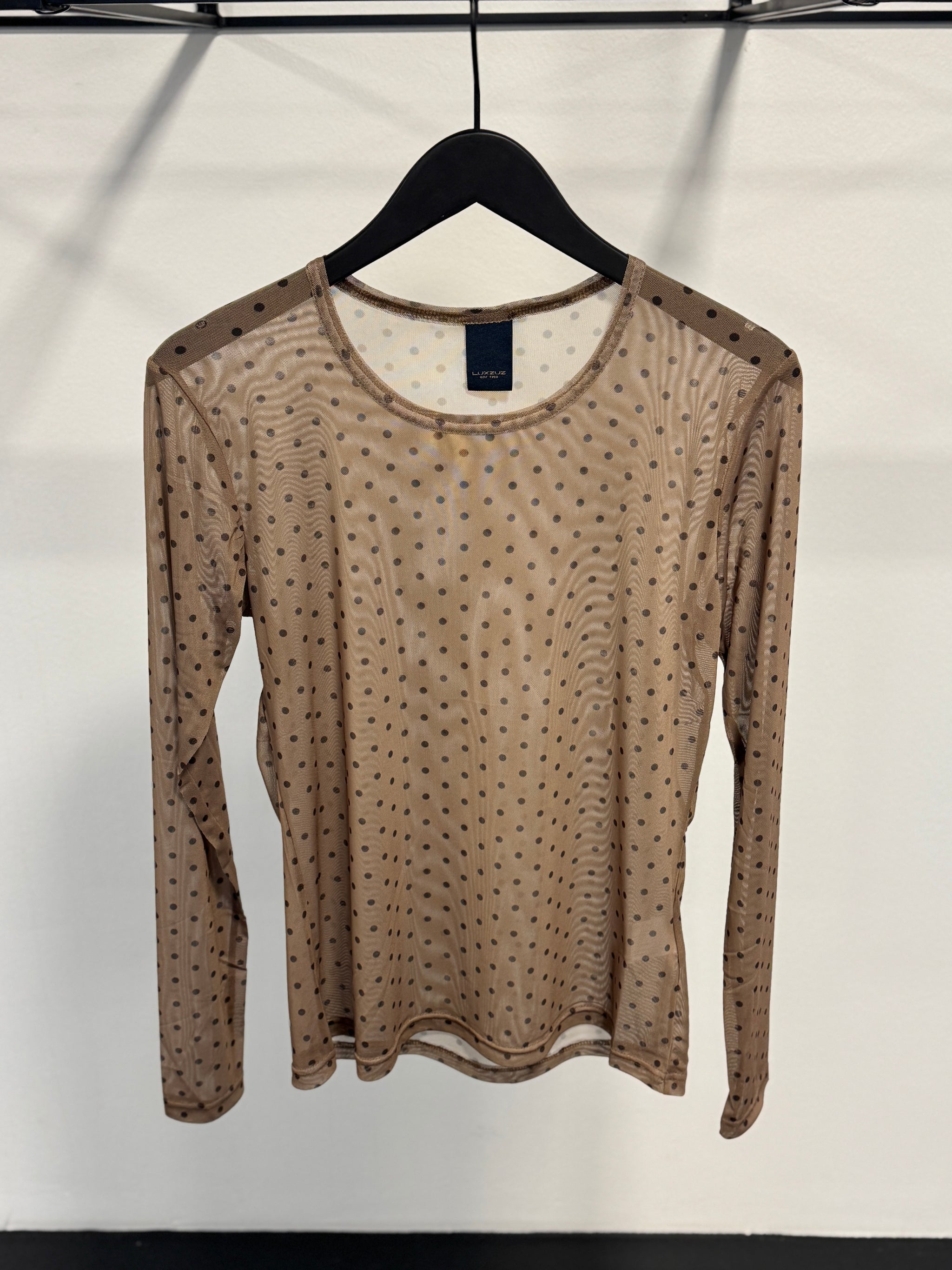 Sigdotti er en let mesh-top med lange ærmer og en klassisk rund halsudskæring. Tøjet har et fint mønster med mørke prikker på en lysebrun baggrund, som giver et detaljeret udtryk til dit outfit. Den gennemsigtige mesh-kvalitet gør den velegnet til lag-på-lag styling, hvor du kan lade mønsteret titte frem. Du kan bruge den under en strik eller som den er over en enkel top.