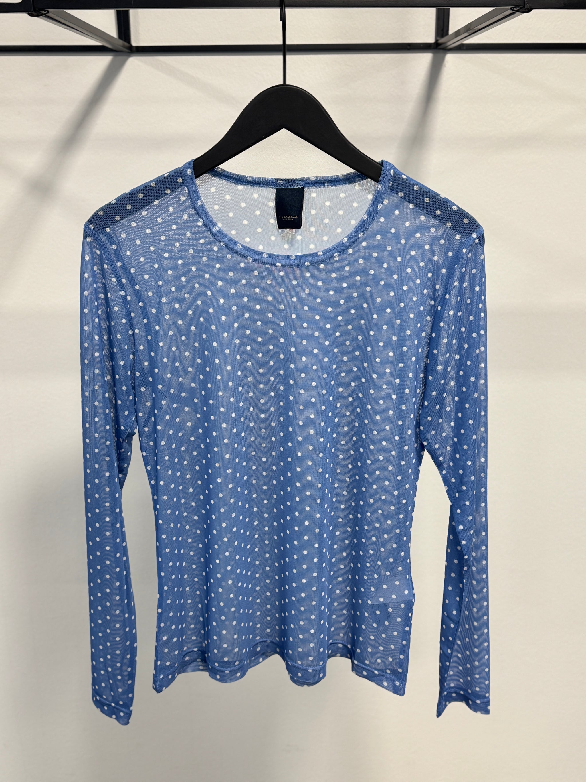 Sigdotti fra Luxzuz er en let mesh-top i en flot blå nuance med hvide prikker. T-shirten har lange ærmer og en rund halsudskæring, og det gennemsigtige materiale giver et let udtryk. Kombinationen af polyester og elastan sikrer, at toppen holder sin form og har en god elasticitet.