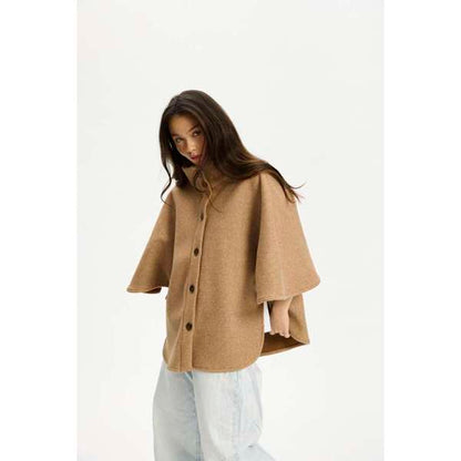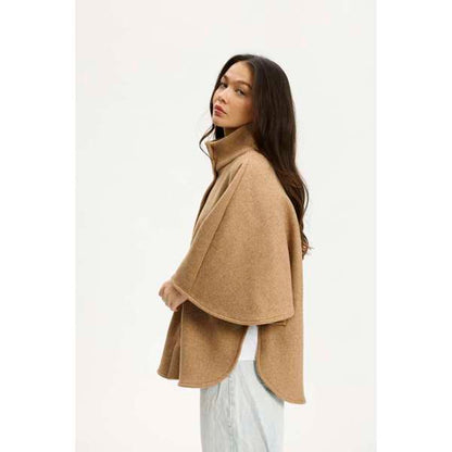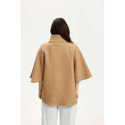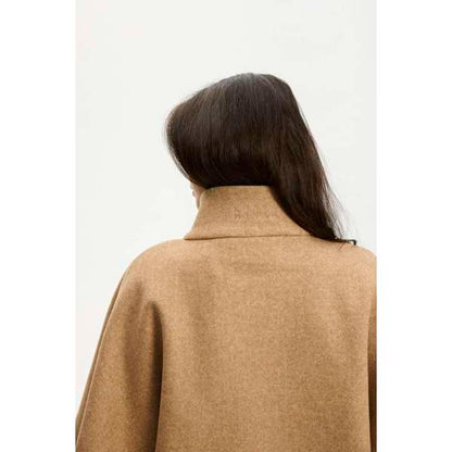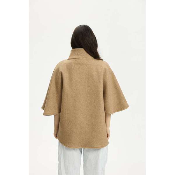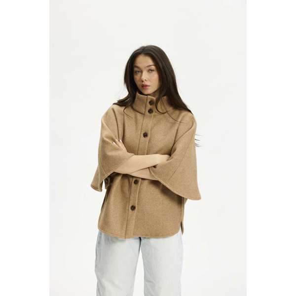 Isla fra Kopenhaken er en fin poncho i farven Incense, der er skabt i en blanding af polyester og viskose. Den har en høj krave og lukkes foran med store, mørke knapper, som giver en flot kontrast til det lysebrune stof. De brede ærmer og den afrundede kant forneden giver ponchoen et karakteristisk snit, der falder flot omkring kroppen.
