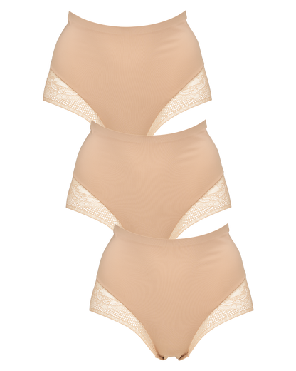 Opgrader din undertøjsskuffe med denne 3-pak fra Missya, der kombinerer et strømlinet look med fine detaljer. Disse maxi-trusser er designet med en sømløs finish, der gør dem ideelle under tætsiddende tøj, mens de delikate blondeindsatser ved benudskæringerne tilføjer et feminint præg til det funktionelle design.