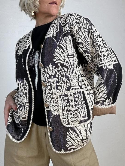 Marseille er en iøjnefaldende jakke med et markant sort og hvidt mønster, der giver masser af karakter til dit outfit. Jakken er konstrueret med en række knapper foran og har store, praktiske lommer, der er markeret med en lys kant. De brede ærmer har et opsmøg, der afslører en kontrastfarvet inderside, hvilket tilføjer en ekstra detalje til det samlede look. Den åbne halsudskæring og det strukturerede stof gør den velegnet som et let lag over dit tøj.