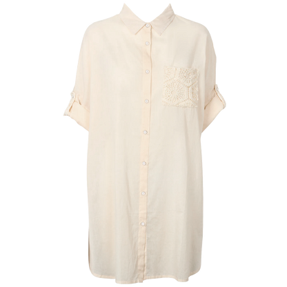 Denne Siena strandskjorte fra Missya er et ideelt valg til strandturen eller afslapning ved poolen. Skjorten er fremstillet i 100% bomuld, hvilket sikrer en let og åndbar kvalitet, der er behagelig mod huden i varmt vejr. Designet er funktionelt med gennemgående knaplukning og ærmer, der kan rulles op, samt en dekorativ brystlomme med blondedetaljer, som giver et gennemført udtryk til dit badetøj. BEMÆRK: Der er lomme på brystet. Denne lomme kan ikke ses på modelbilledet, men det er samme skjorte, som er på modelbilledet.