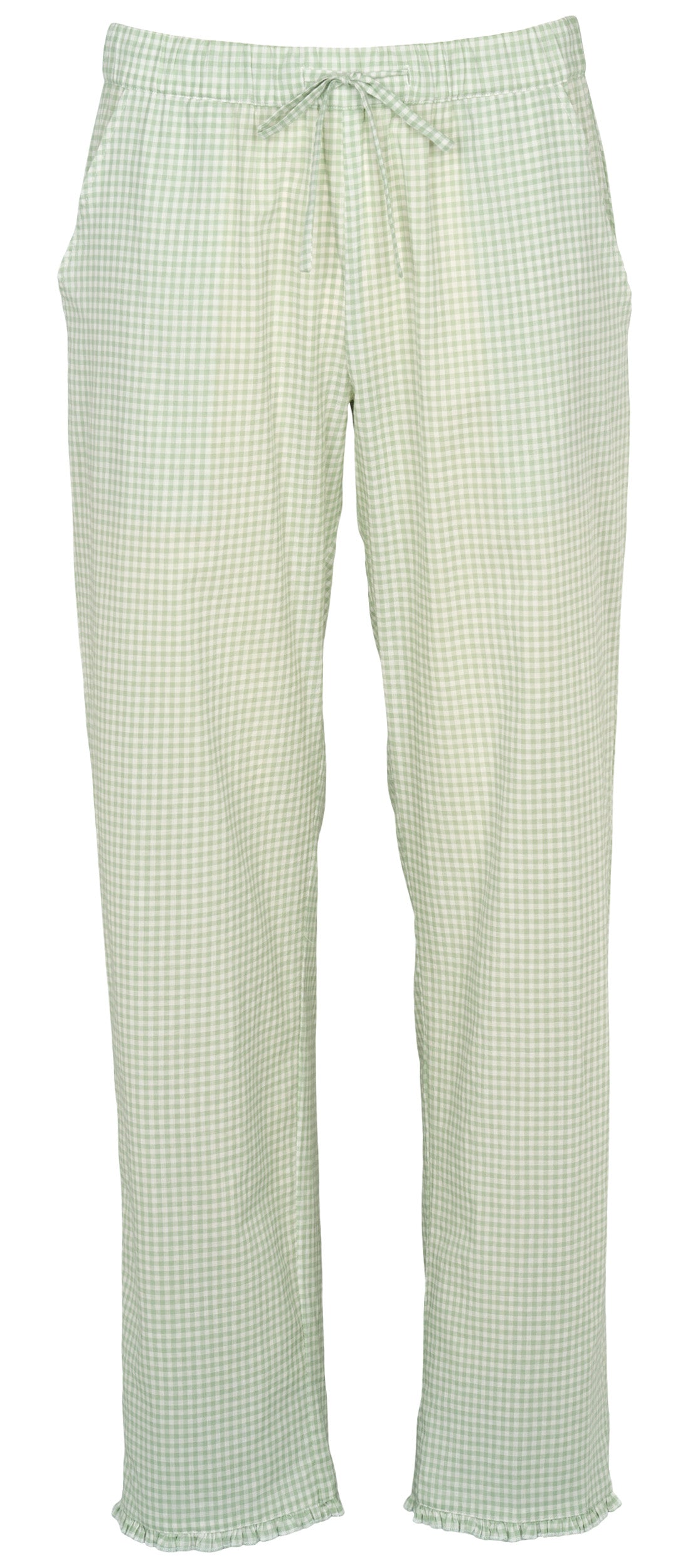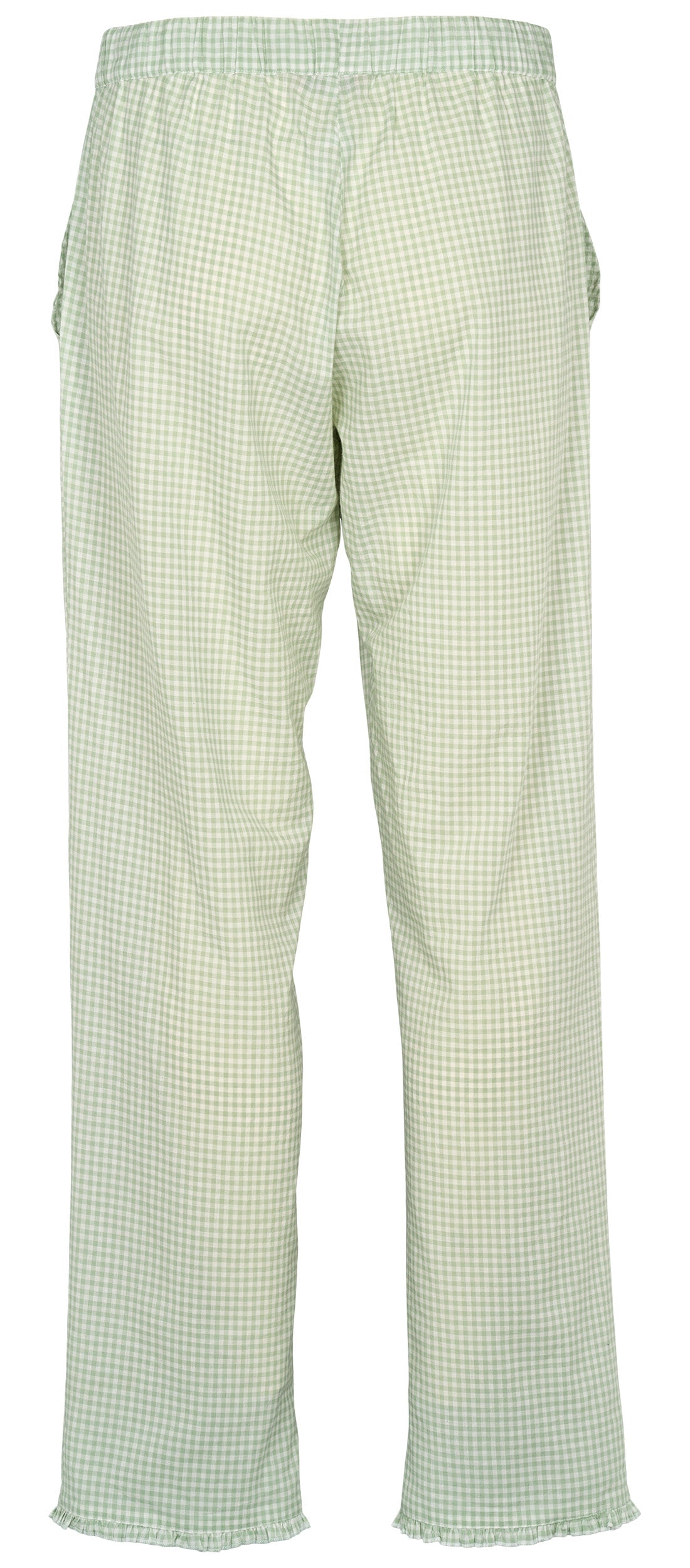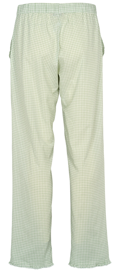 Josie fra Missya er et par klassiske natbukser i en let 100% bomuldskvalitet. Bukserne har et grønt og hvidt ternet mønster, der giver et friskt look til din garderobe. De er designet med en elastisk talje, som du kan justere med et bindebånd foran, og har praktiske sidelommer. Som en fin detalje er bukserne afsluttet med en lille flæsekant ved benåbningen, der giver et feminint udtryk. Det lige snit i benene sikrer, at bukserne sidder løst.