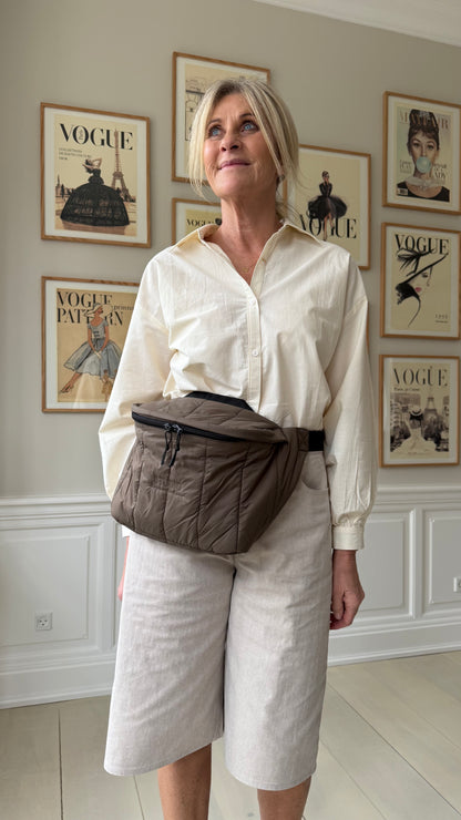 Brug tasken sammen med en lys hørskjorte og et par matchende shorts for at skabe et gennemført look til sommerens udflugter. Du kan også kombinere den med en klassisk trenchcoat og dine yndlingsjeans, hvor taskens brune farve og vatterede struktur giver et flot modspil til det glatte overtøj. Den justerbare rem gør det muligt at bære tasken både omkring livet eller skråt over brystet, alt efter hvad der passer bedst til dit outfit.