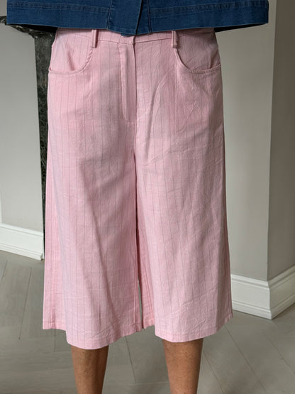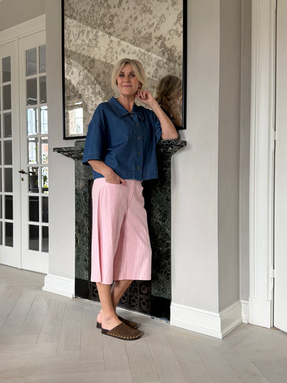 Adrielle er et par lette shorts i en smuk lyserød farve med fine, mørke striber, der giver et roligt og klassisk udtryk. De er skåret med god vidde i benene, hvilket giver dem et luftigt snit, der minder om en nederdel. Shortsene er fremstillet i en blanding af bomuld og viskose og er udstyret med praktiske detaljer som bæltestropper, skrålommer foran og en klassisk lukning med knap og lynlås.